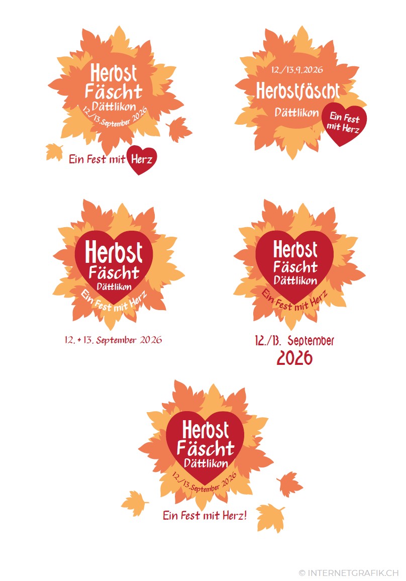 Diese Idee wurde später fallengelassen und auf ein hübsches vielblättriges-Design mit Herbst-Thema gesetzt, das in der Mitte ein Herz zeigt mit dem Slogan „Ein Fest mit Herz“. Der Name „Herbstfest“ wurde leicht in das Schweizer Mundartwort „Herbstfäscht“ geändert. Das ist das finale Logo für das Herbst Fäscht Dättlikon 2026: