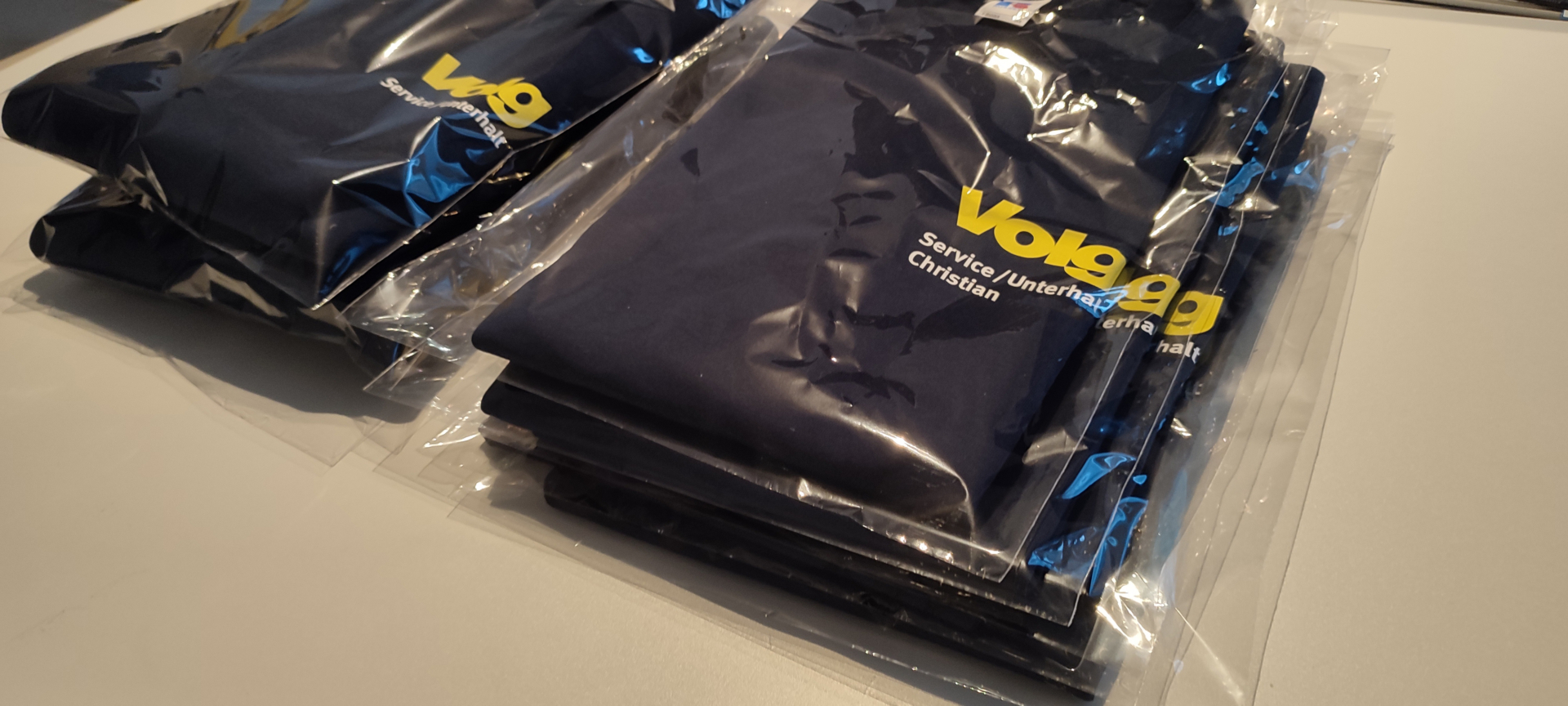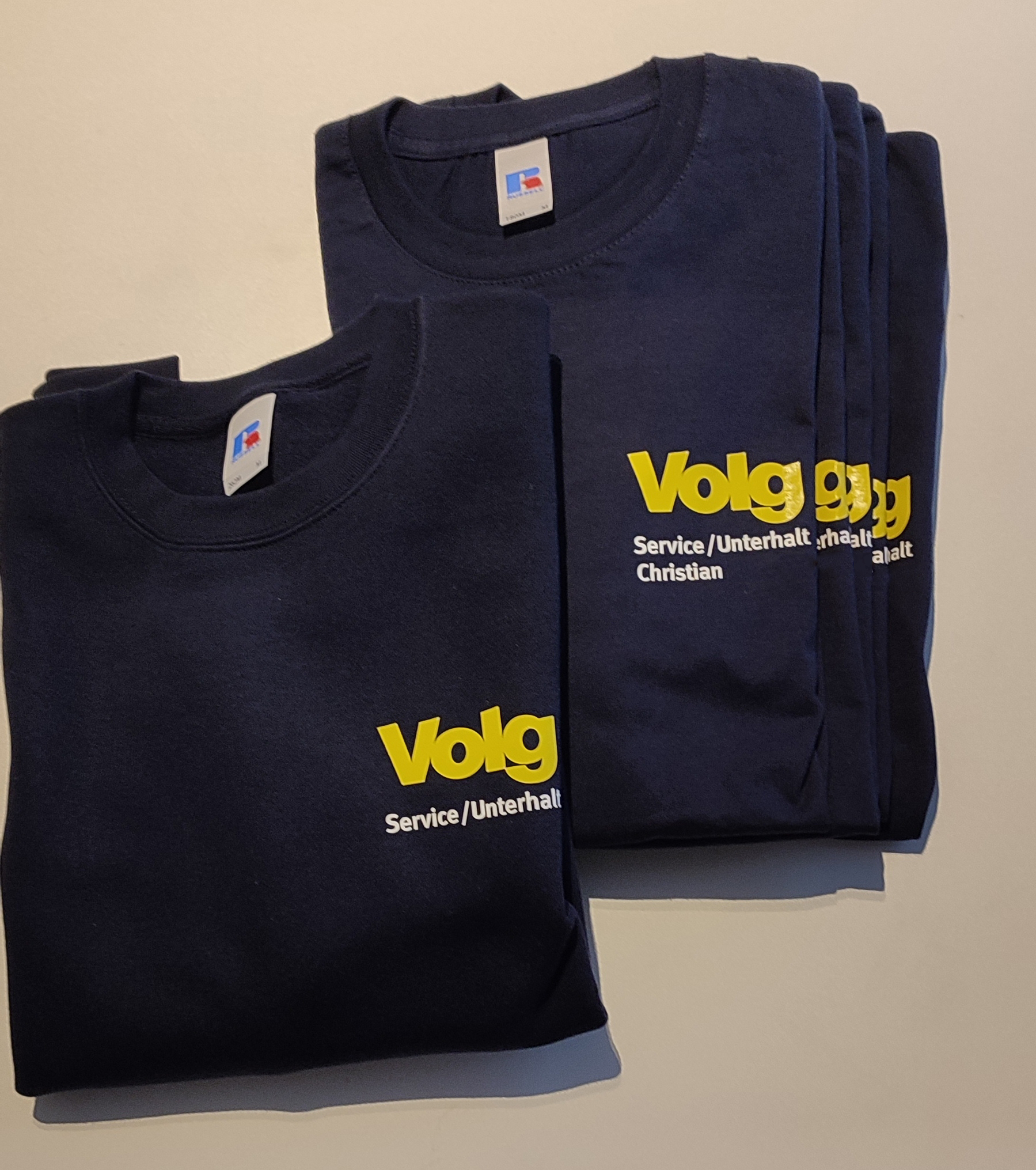 Die weisse Schrift und das zitronengelbe Logo wird dabei auch auf die schönen dunkelblauen Textilien, die wir für den VOLG verwenden, gestochen scharf. Dank Flexdruck ist unser Weissdruck hoch deckend auf dunklem Untergrund. Die T-Shirts und Pullis werden seit Jahren ständig im harten Einsatz des Service / Unterhalt getragen und gewaschen und sehen auch nach Jahren tiptop aus. Ein sehr schöner Auftrag für den VOLG, auf den wir stolz sind.