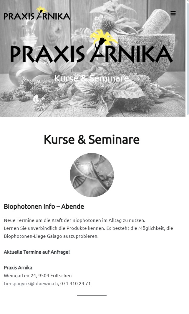 Die ganze neue Website der Praxis Arnika ist natürlich responsive, sie passt sich allen Bildschirmformaten automatisch an. Vom grossen Desktop-Bildschirm bis hin zum kleinen Smartphone. Für Smartphones wird auch die Funktionalität verändert. So wird die bestehende Navigationsstruktur entfernt und durch eine andere Navigation ersetzt, die auf Smartphones und kleinen Bildschirmen besser bedient werden kann.