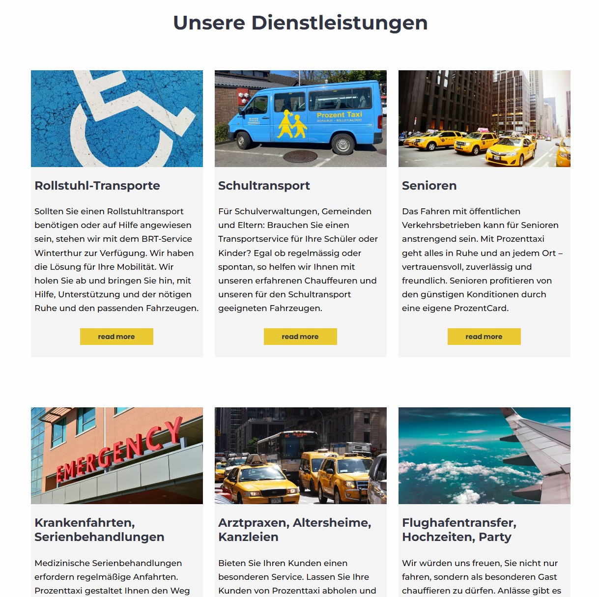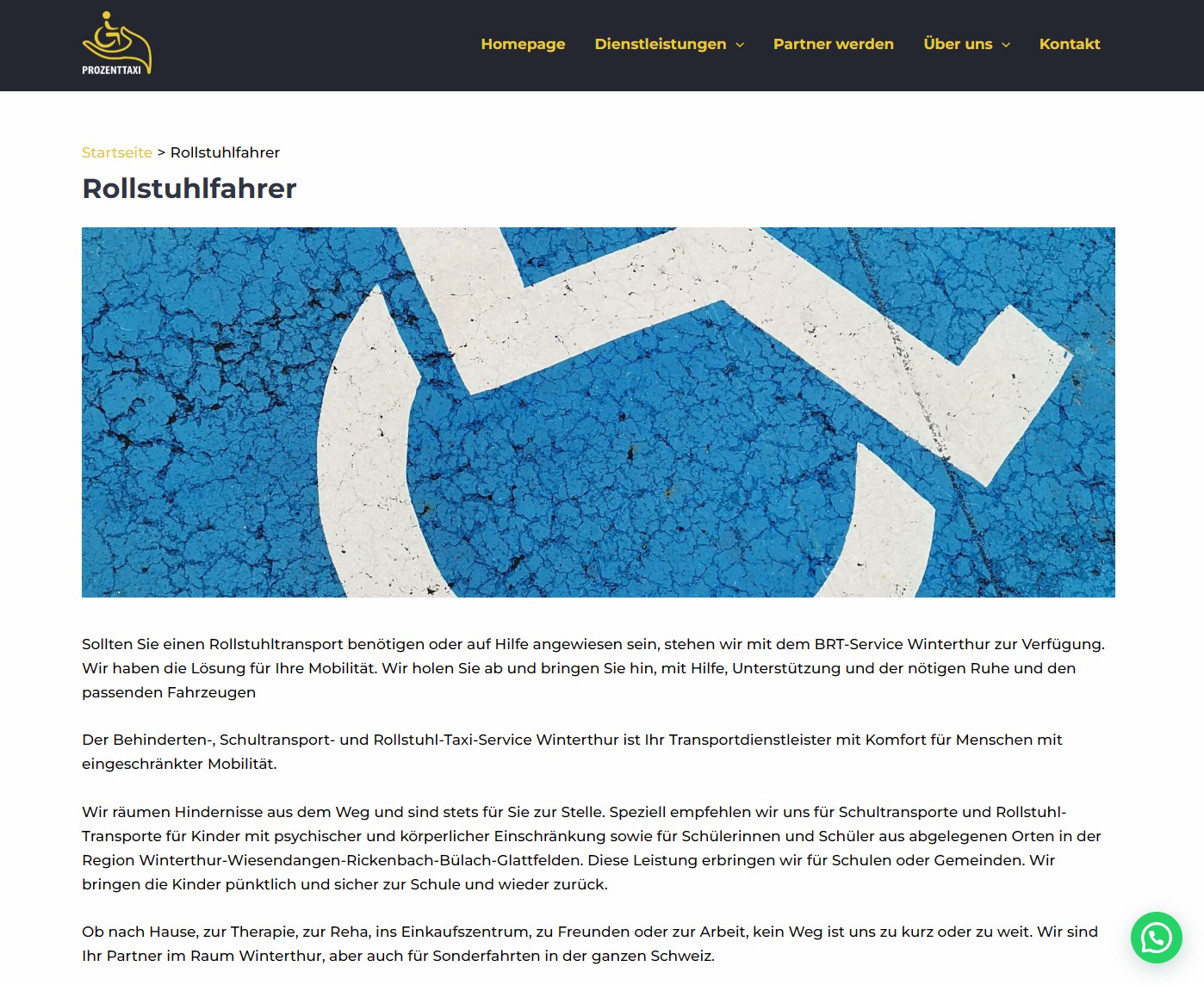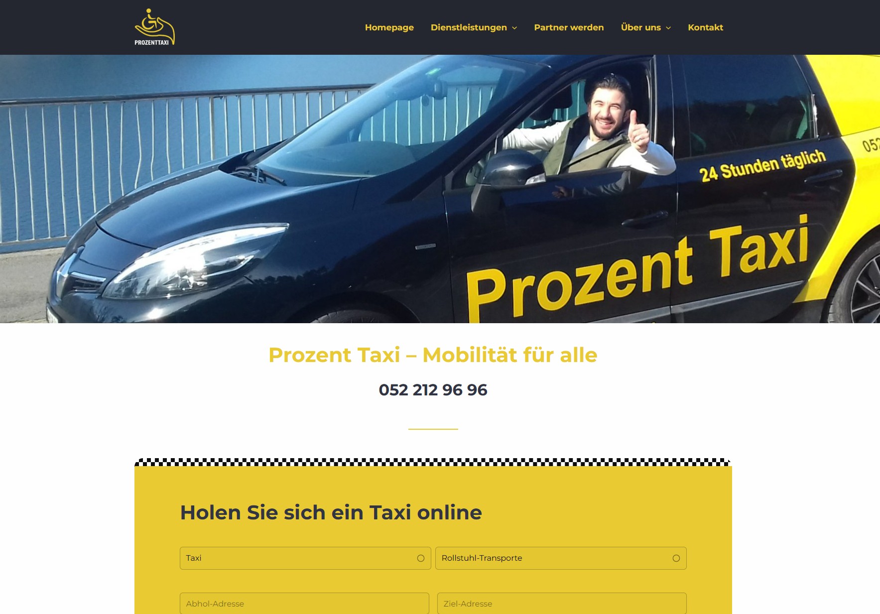 Das Taxi-Unternehmen „Prozenttaxi.ch“ in Winterthur-Seuzach ist spezialisiert auf Rollstuhl- und Behinderten-Transporte. 2025 durfte INTERNETGRAFIK die Website des Transportunternehmens neu gestalten. Die Website basiert auf dem System „Word Press“. Das verwendete WordPress Template war veraltet und musste ersetzt werden. Highlight der Website sind das Online-Taxi-Formular auf der Hauptseite, mit dem man sich schnell und unkompliziert ein Taxi bestellen kann, sowie die Kontaktmöglichkeit direkt per WhatsApp, die immer häufiger genutzt wird, sowie die vielen positiven Referenzen seiner Kunden.