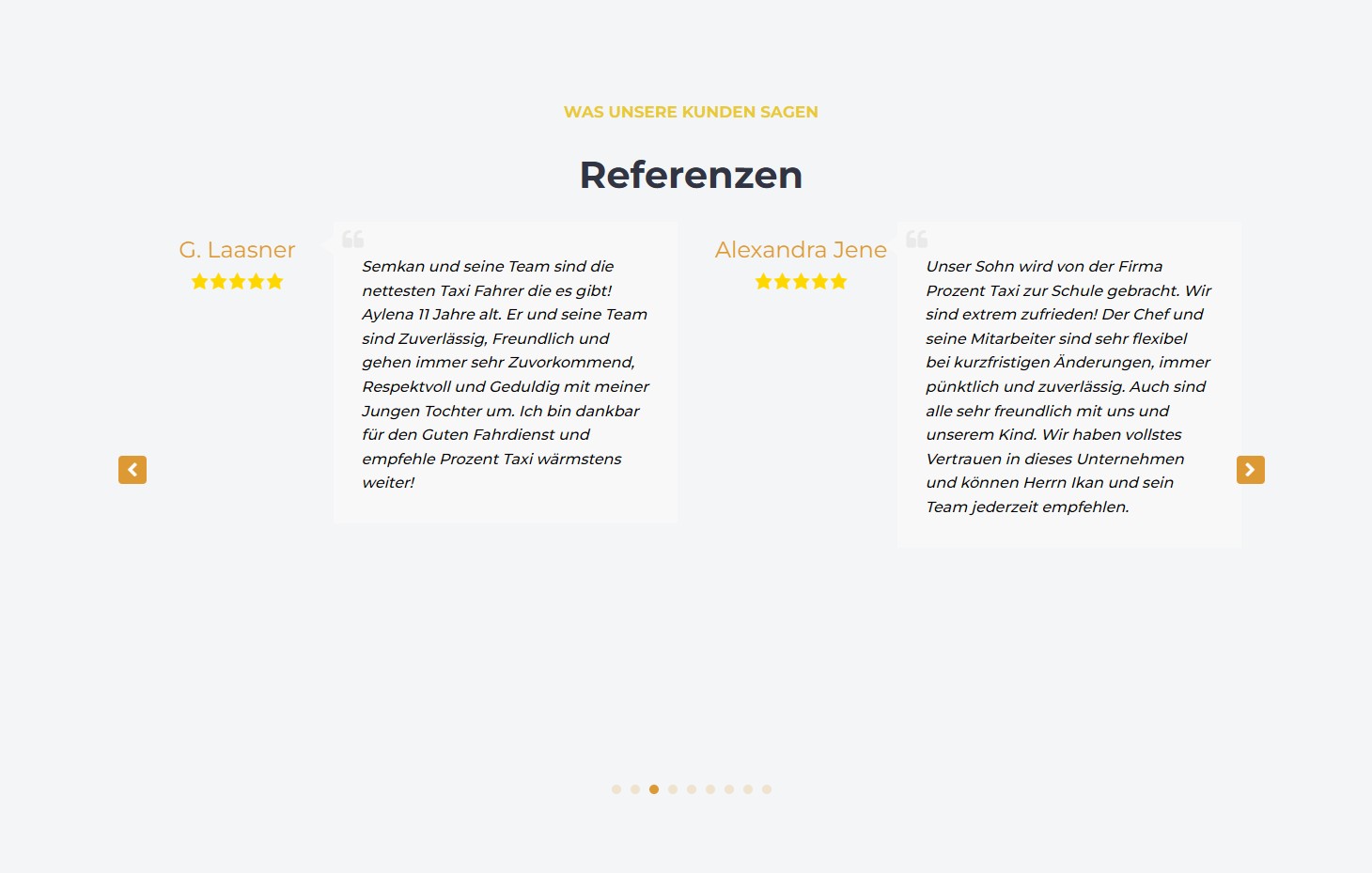Auf einer eigenen Seite werden in einer dynamischen Slideshow alle Fahrzeuge des innovativen Taxi Unternehmens präsentiert. Das reicht von konventionellen Mercedes-Kombi Taxis über Rollstuhl-Taxis mit ausfahrbarer Rampe, bis hin zum klimatisierten Schulbus für die Schultransporte, die das Unternehmen ebenfalls anbietet.