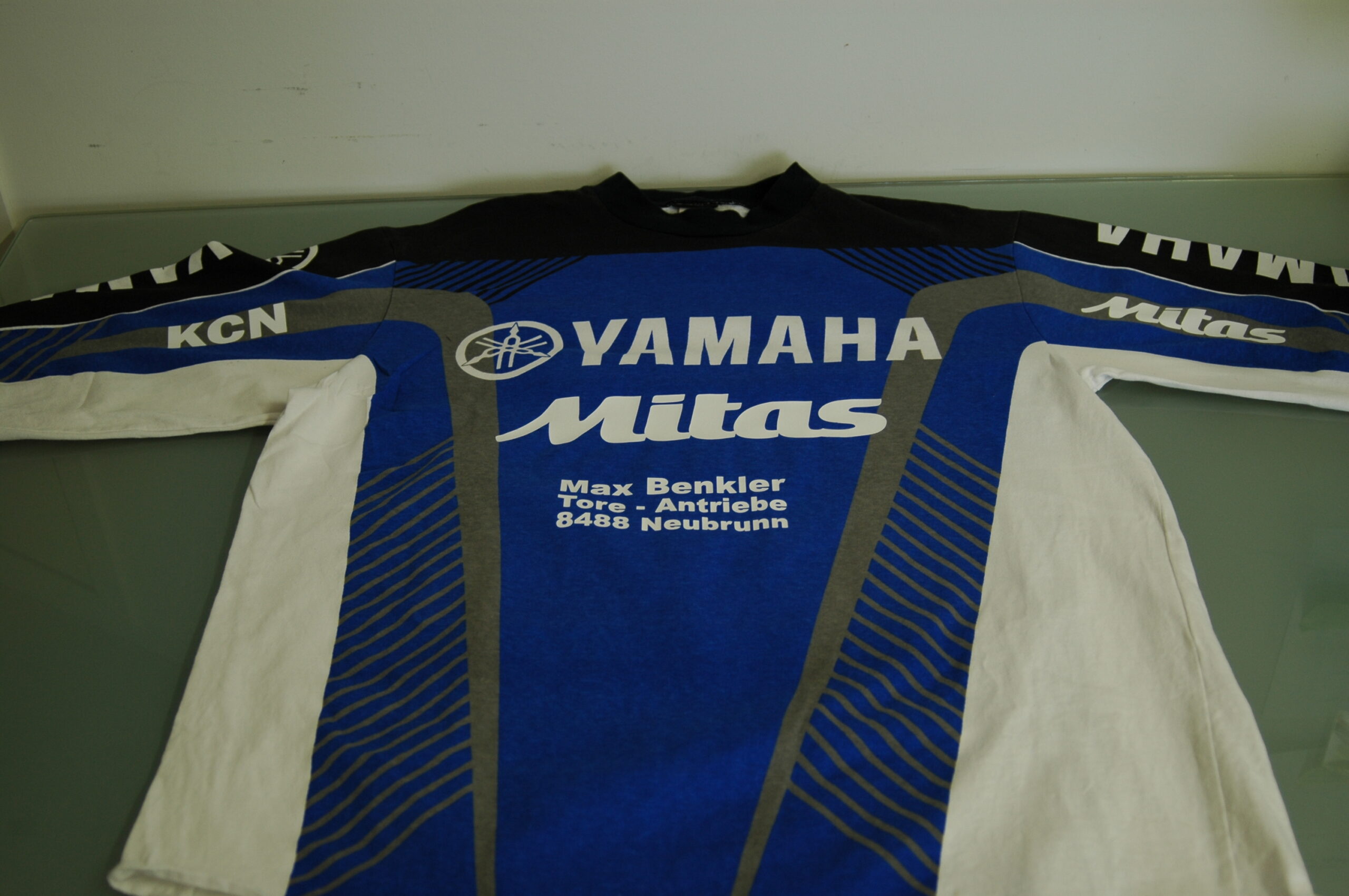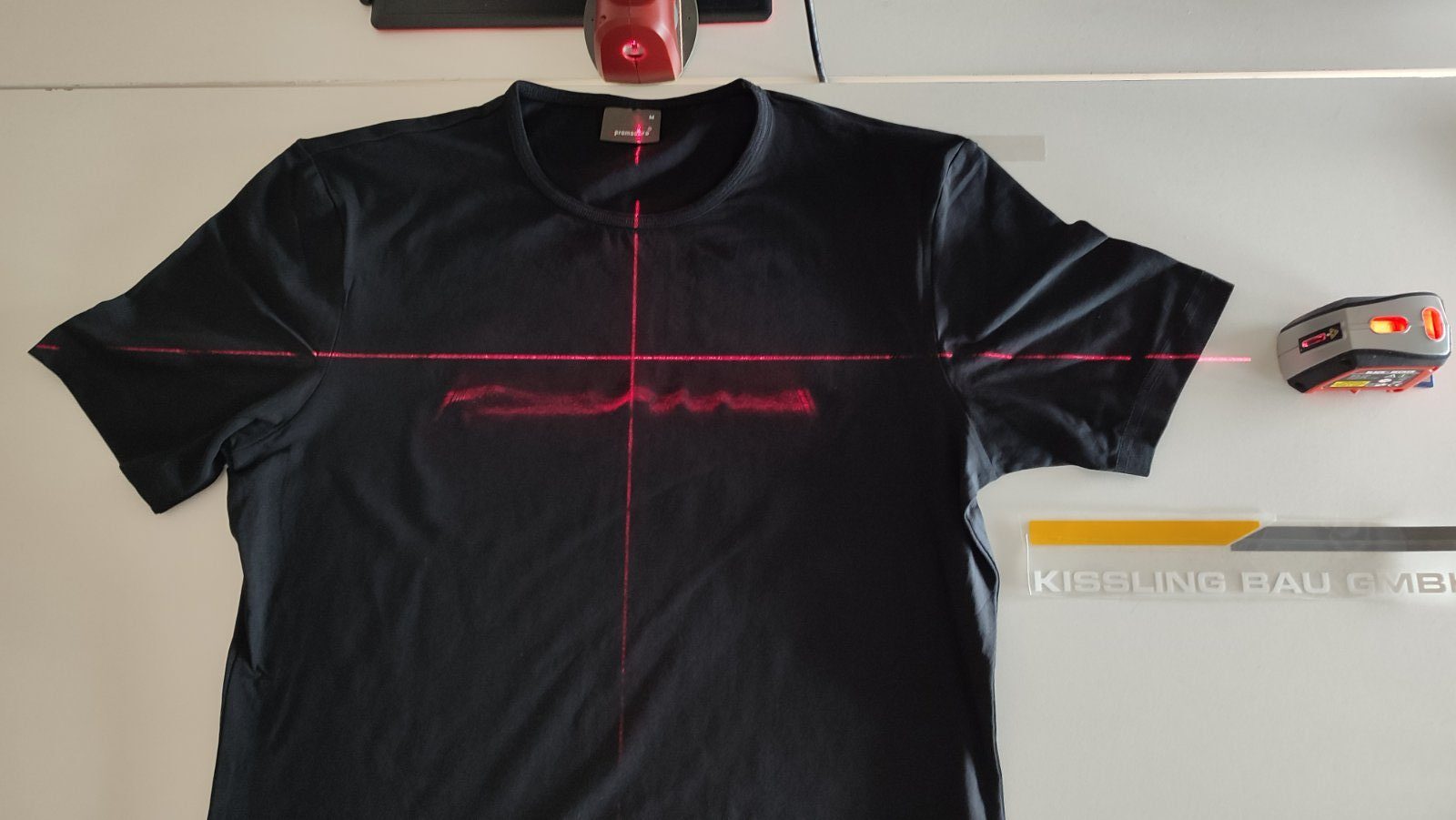 Beim Platzieren helfen uns mehrere Laser-Projektoren, die rote Laserlinien auf das Textil projizieren. So wird die Position zentimeter-genau und ist bei allen Shirts an der gleichen Stelle. Vor allem bei vielen Stücken ist man dank der Laserstrahlen schneller.