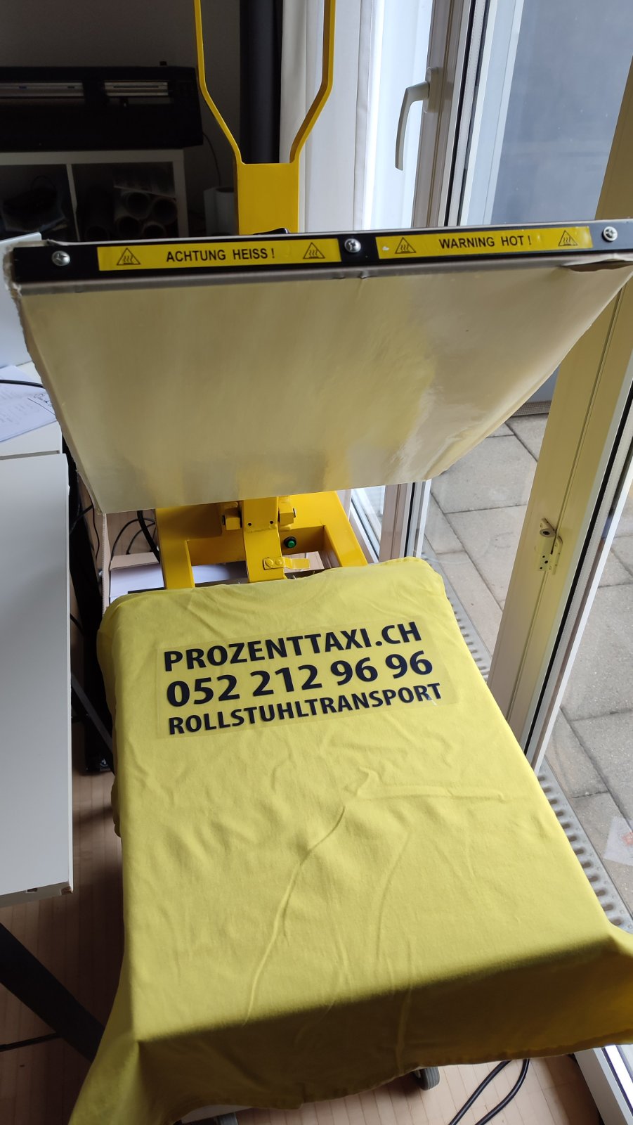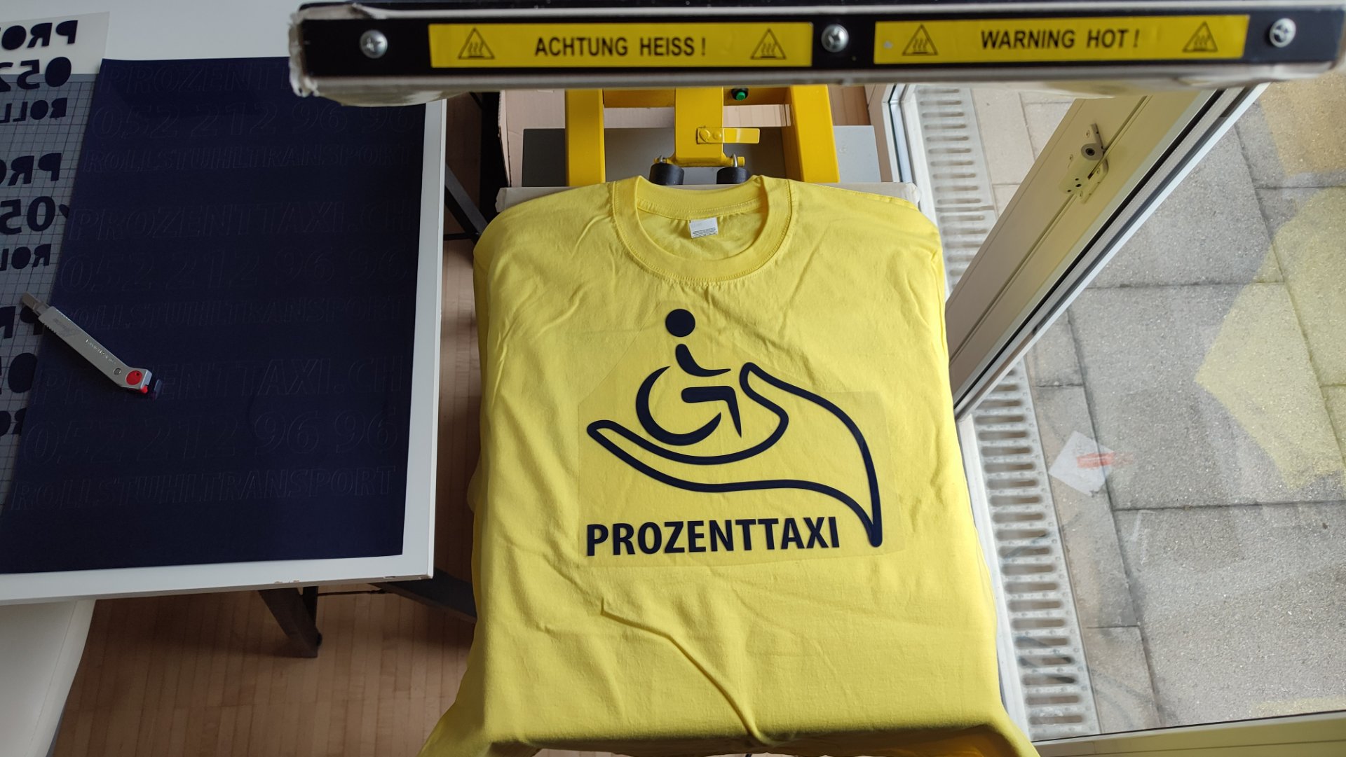 Jetzt wirds heiss! Das T-Shirt kommt unter die Heizpresse. Mit grossem Druck von 700 Kilo und einer Temperatur von je nach Folie 140 bis 160 Grad wird der Plott für ein paar Sekunden mit dem Textil verbunden.