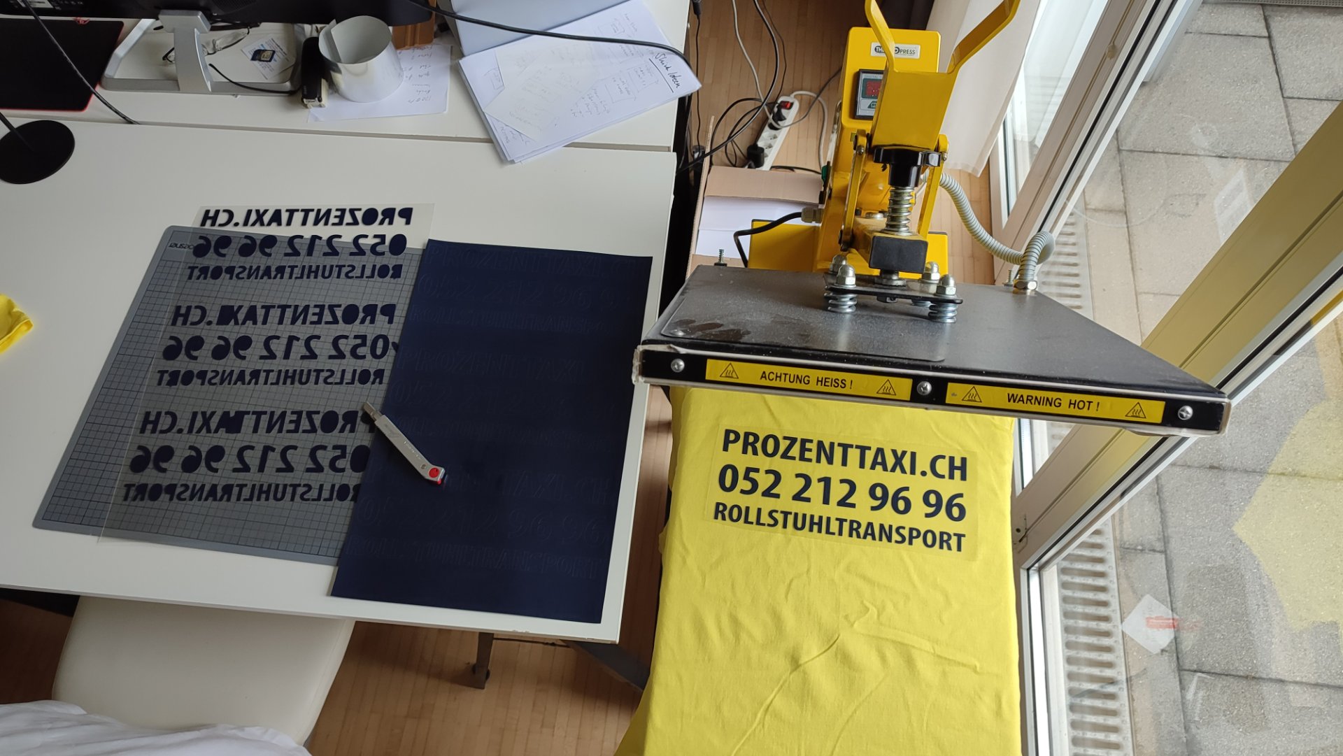 Zuerst schneidet ein Computer-Plotter, gesteuert von unserem Computer aus Adobe Illustrator heraus, aus einer hauchdünnen farbigen Polymerfolie das Druckmotiv seitenverkehrt aus. Sie können wählen aus vielen Farben der Folien. Es gibt sogar Gold und Silber, die echt glänzen und métalisiert sind, sowie grelle Neonfarben. Die ganze Farbkarte sehen Sie weiter unten.
